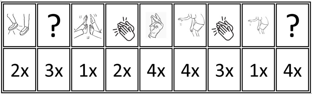 Oefen met de kinderen de nieuwe geluiden. Maak er eens een geluidketting van (Ik Ga Op Reis En Neem Mee, maar dan met bodypercussie-geluiden). Hoeveel geluiden kunnen jullie achter elkaar onthouden als er steeds eentje bij komt?