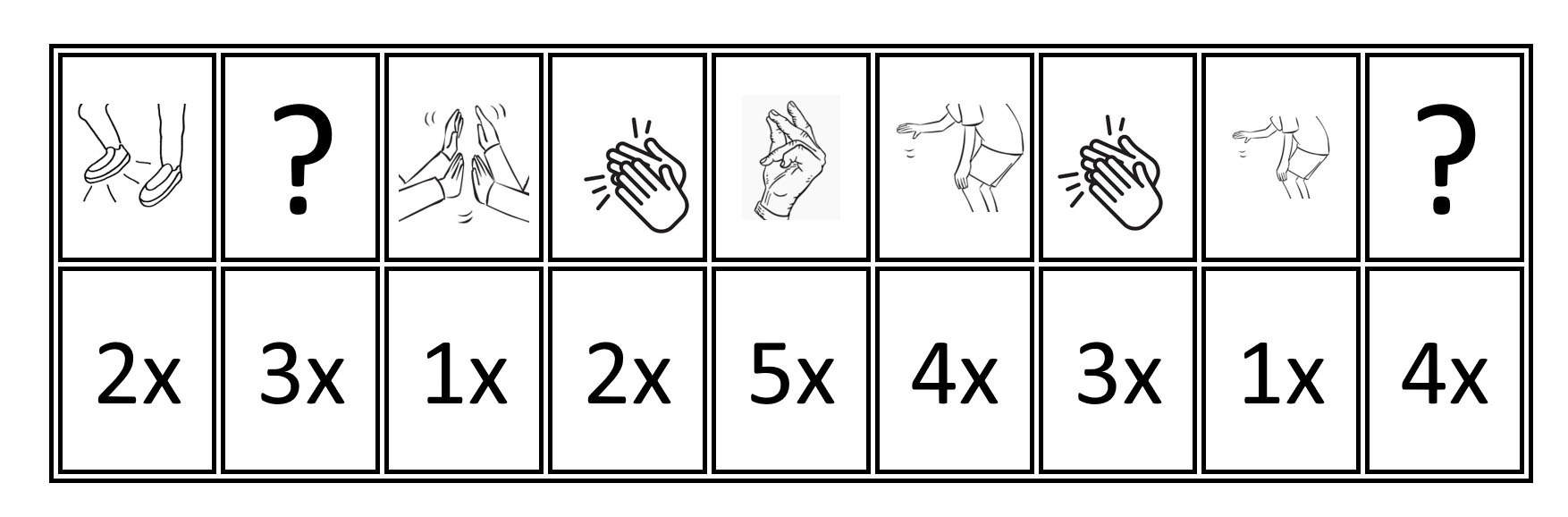 De kinderen knippen de tegeltjes uit en leggen de geluiden in een zelfbedachte rij en daar onder de aantallen. Bij de vraagtekens mogen de kinderen zelf een geluid bedenken.