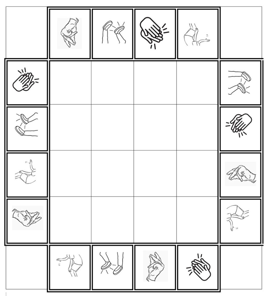 Print nu een leeg vierkant uit (klik hier voor .pdf) en maak met je groepje een eigen Bodypercussie-Vierkant.
