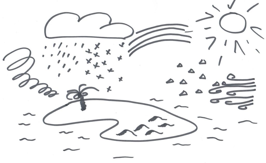Op deze weerkaart zie je verschillende weertypes. Bespreek met elkaar met welke weertypes je herkent en met welke instrumenten de weertypes gespeeld zou kunnen worden.