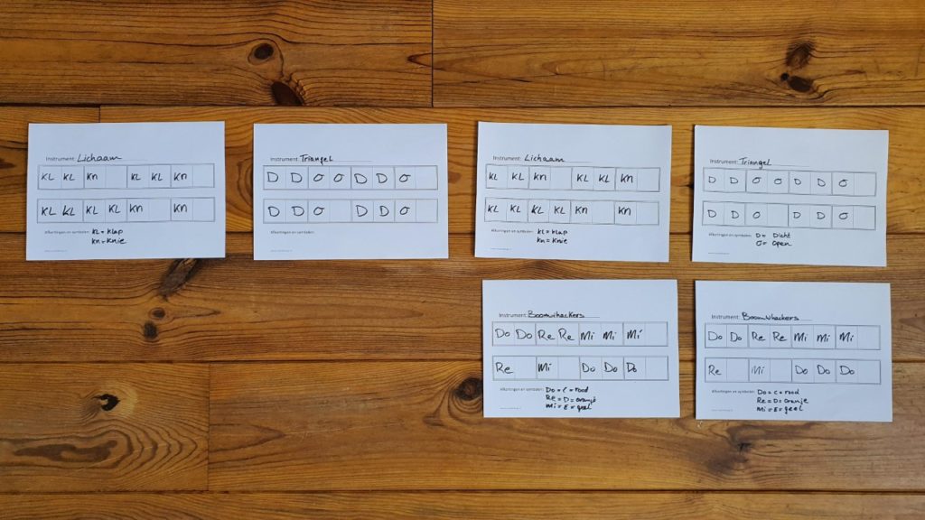 Maak nu met elkaar een mooie compositie door de werkbladen op de grond neer te leggen. Naast elkaar (ritmes worden achter elkaar gespeeld) en boven elkaar (ritmes worden tegelijk gespeeld).