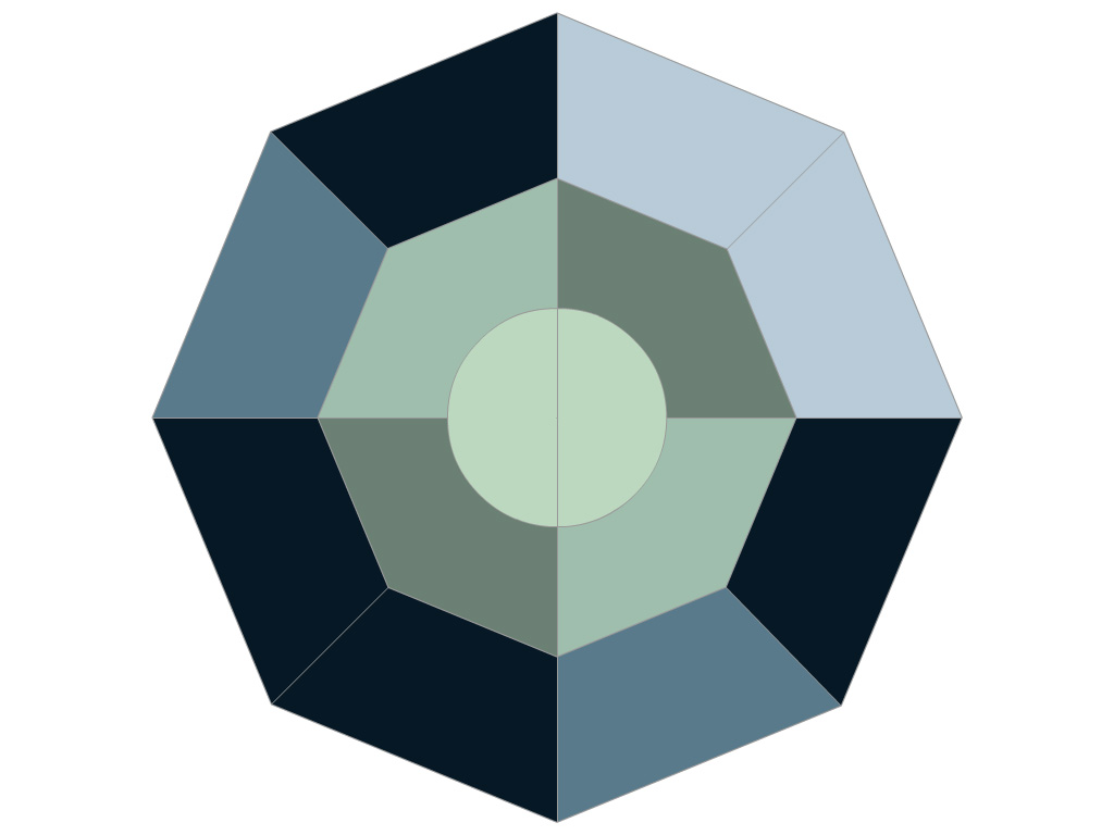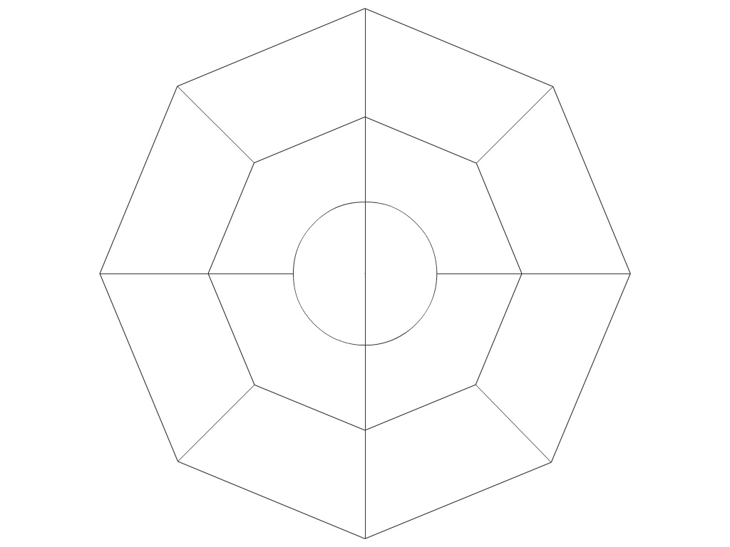 Het midden bestaat uit twee facetten, de eerste ring uit vier en de buitenste ring uit acht facetten.