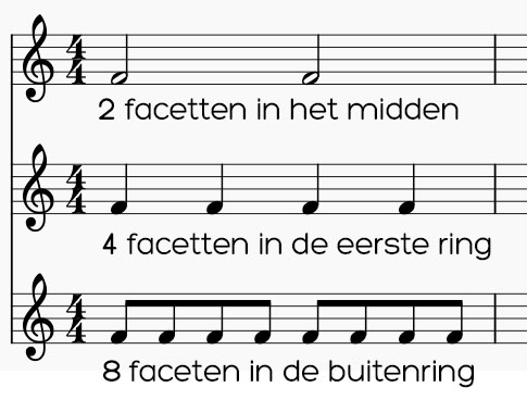 De eerste ring met de vier facetten geeft de maatsoort aan. Deze diamant staat in de vier-kwarts maat. Je telt dus steeds tot vier.