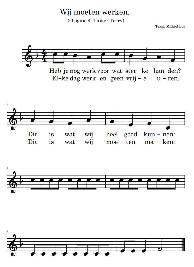 Dit is een af-maak-lied. Op de noten waar geen tekst staat kunnen kinderen (in groepjes van 2/3/4) hun eigen werkzaamheden verzinnen en opschrijven op het werkblad. Op het werkblad komt in elk vakje één lettergreep. Zoals je kunt zien in het voorbeeld bestaat elke werkzaamheid uit vier lettergrepen. Dat betekent dat het voor de kinderen soms puzzelen is om het voor elkaar te krijgen. Maar dat hoort nu eenmaal bij het schrijven van een liedtekst. 🙂