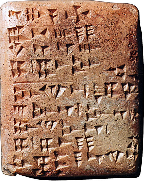 Oudste schrift, spijkerschrift, bedoeld om vee en graan mee te tellen.
